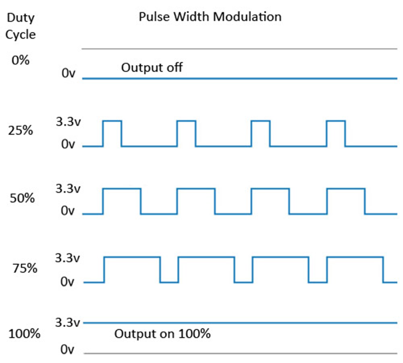 Tot nu toe hebben we de Arduino alleen gebruikt om output signalen handmatig hoog of laag te zetten. Een andere vorm van output kan worden gerealiseerd met PWM (Pulse With Modulation). Met PWM kun je het output signaal dat uit een pin gaat beïnvloeden. Deze techniek wordt bijvoorbeeld toegepast om bepaalde type motoren harder en zachter te laten draaien of om leds minder fel te laten branden of te laten pulseren. Hoe het werkt is dat we kunnen zeggen dat de output bijvoorbeeld 25% van de tijd aan moet staan en 75% van de tijd uit moet staan, maar iedere andere verdeling is ook mogelijk. Doordat het signaal heel snel wisselt, is deze wisseling met het blote oog niet te zien, maar krijgen we wel een zwakker signaal en zal een motor minder snel draaien, of een led minder fel branden. In figuur 4.2 is schematisch te zien hoe het output-signaal er uit kan zien.