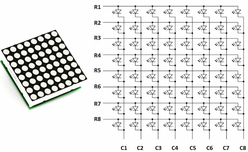 Voordat we gaan beginnen met programmeren, eerst even een stukje uitleg hoe een LED-matrix werkt. Zoals de naam al doet vermoeden, is een led-matrix een matix van allemaal leds. In ons geval telt de matrix acht rijen en acht kolommen. Hoe de matrix intern geschakeld is, is te zien in figuur 4.8.