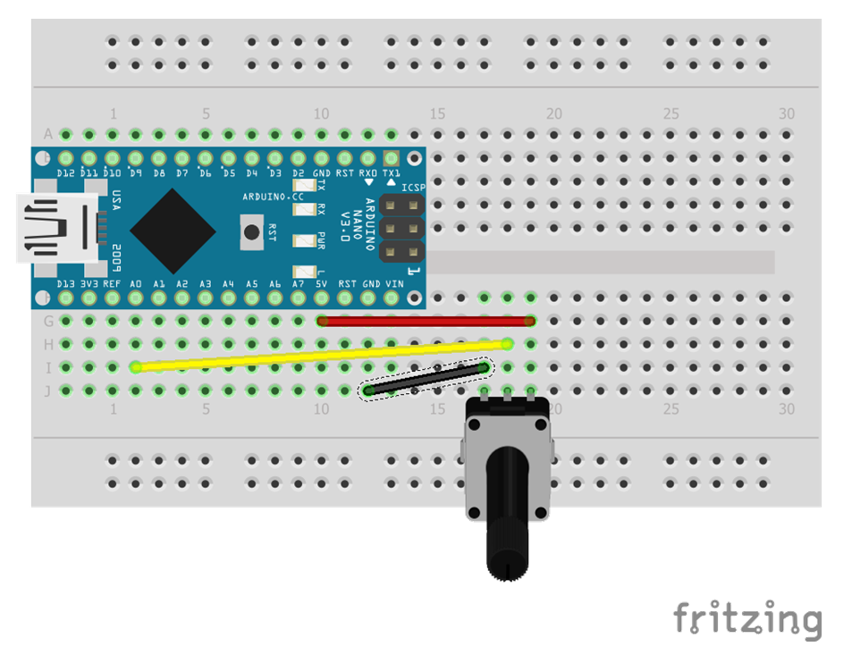 Een potmeter heeft drie pinnen. De ene buitenste pin sluit je aan op de 5V van de Arduino en de andere sluit je aan op een Ground. Het maakt nu even niet uit welke pin je waarop aansluit. Het verschil zit hem erin dat je als je de knop van de potmeter naar links draait je de potmeter in de ene situatie 'dicht' draait en in de andere situatie 'open' draait.