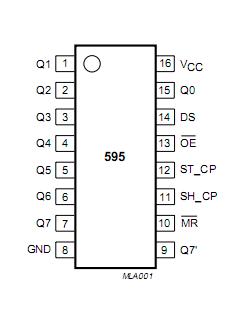Dit is de shiftregister clock input. Als deze pin van laag naar hoog wordt gezet, worden alle bits een plek in het register opgeschoven. - MR