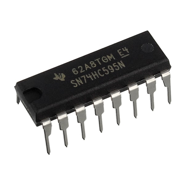 In het vorige blok hebben jullie geleerd hoe je een 7-segment-display moet aansturen. Nu is het zonde om 8 pinnen van je Arduino op te offeren aan een display, zeker als je meerdere van deze displays wilt gebruiken. Om dat op te lossen bestaan er schuifregisters (shiftregister in het Engels). In afbeelding 4.2 zie je zo'n schuifregister staan.