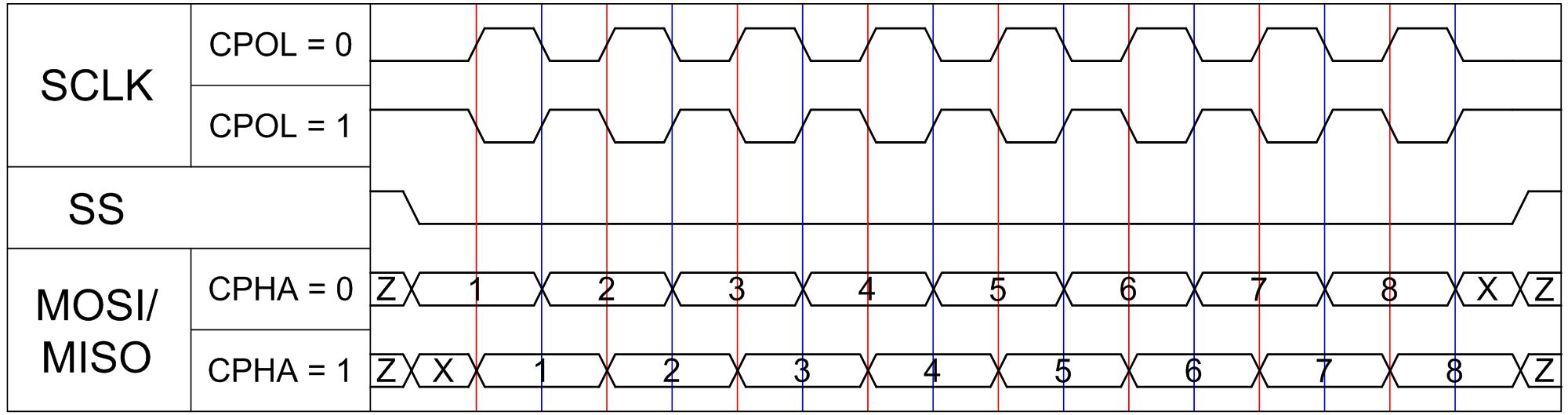 Met de CPHA kunnen we vervolgens instellen wanneer de bits op de MISO en MOSI kabel klaargezet worden en wanneer deze worden gelezen. Als we de CPHA op 0 instellen wordt de bit op de rising edge (als het signaal van laag naar hoog gaat) uitgelezen en op de falling edge (als het signaal van hoog naar laag gaat) wordt het volgende bit klaar gezet. Om dit allemaal visueel te maken, hebben we hieronder het timing diagram van een SPI verbinding opgenomen.